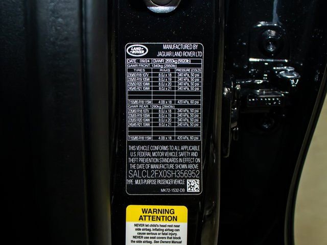 11 Speakers, 12-Way Heated Electric Front Seats w/Driver Memory, Air Conditioning, AM/FM radio: SiriusXM, Apple CarPlay & Android Auto, Auto High-beam Headlights, Auto-dimming door mirrors, Auto-dimming Rear-View mirror, Automatic temperature control, Brake assist, ClearSight Interior Rearview Mirror, Click & Go Integrated Base Unit, Cold Climate Package, Delay-off headlights, Dual front impact airbags, Dual front side impact airbags, DuoLeather Seat Trim w/Contrast Stitch, Electronic Stability Control, Emergency communication system: InControl Protect, Emergency Pack, Exterior Parking Camera Rear, Four wheel independent suspension, Front anti-roll bar, Front dual zone A/C, Front fog lights, Fully automatic headlights, Garage door transmitter: HomeLink, Headlight Power Wash, Head-Up Display, Heated front seats, Heated Rear Seats, Heated steering wheel, Heated Windscreen, Illuminated entry, Knee airbag, Land Rover Handover Pack, Leather Shift Knob, Low tire pressure warning, Memory seat, Navigation system: Pivi Pro, Occupant sensing airbag, Outside temperature display, Overhead airbag, Overhead console, Power door mirrors, Power driver seat, Power Liftgate, Power passenger seat, Premium Interior Protection & Storage Pack, Radio: Meridian Sound System, Radio: Meridian Surround Sound System, Rain sensing wipers, Rear anti-roll bar, Rear fog lights, Remote keyless entry, Security system, Speed control, Speed-sensing steering, Speed-Sensitive Wipers, Split folding rear seat, Spoiler, Steering wheel mounted audio controls, Technology Package, Telescoping steering wheel, Tow Hitch Receiver, Turn signal indicator mirrors, Wheels: 19" Style 5136 Gloss Dark Grey.